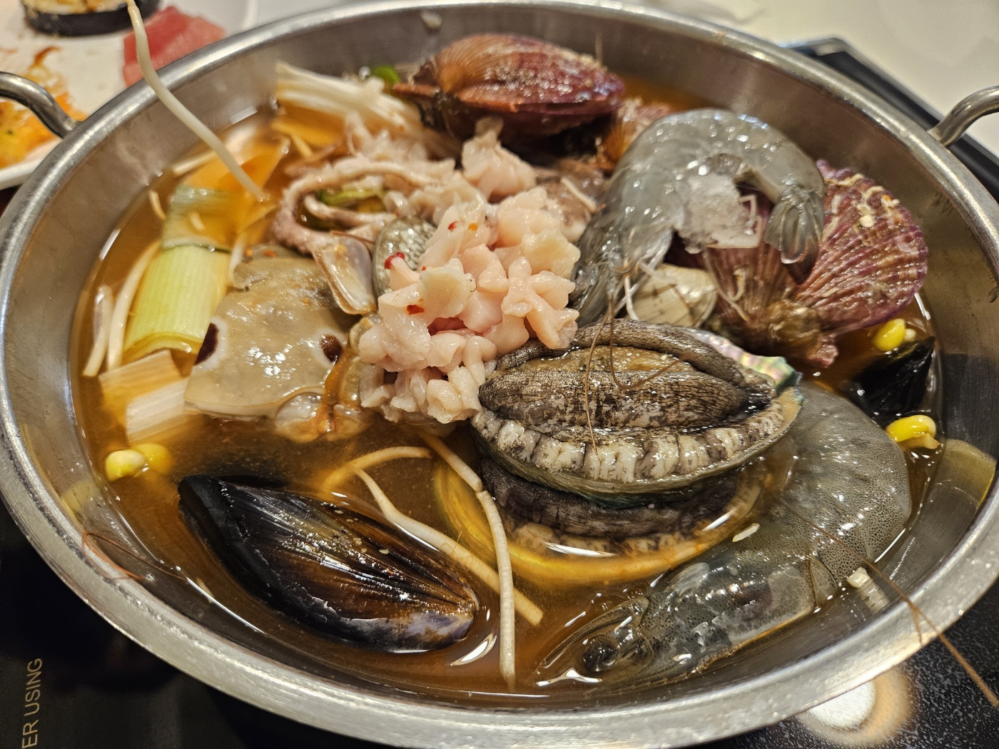 다른 해산물 뷔페와 다르게 매운탕을 준다. 매운탕에 들어가는 꽃게, 곤이, 낙지 등 여러가지가 구비되어 있어서 계속 추가해 먹어도 된다. 그리고 전복이랑 낙지도 넣어주셔서 진정한 매운탕의 느낌 굳