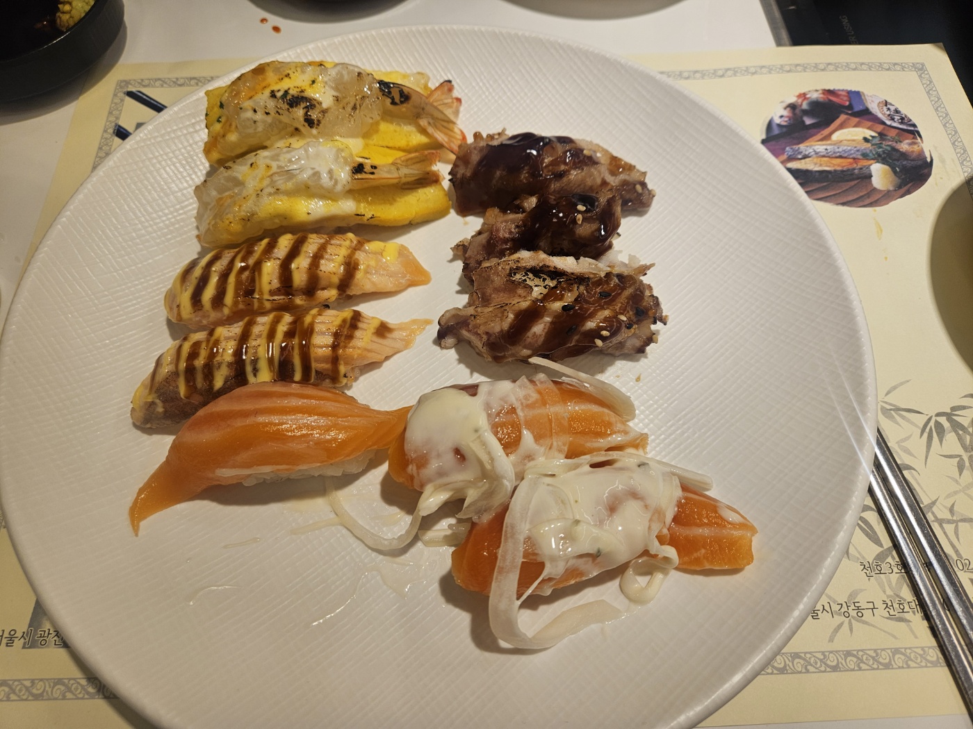 연어초밥 참치 계란새우초밥 육회 새우튀김 청어 게장 소라 한치초밥 등등